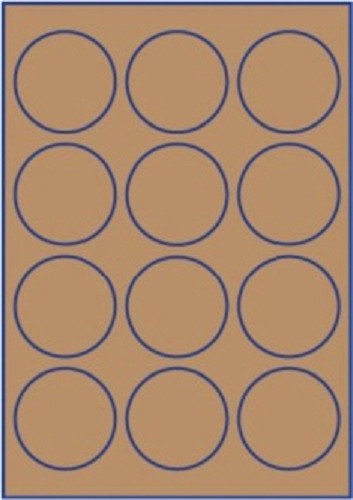Copieeretiketten in kringloop naturelbruin. De maat van het etiket is rond Ø 60 mm. Per A4-vel: 3 rijen van 4 etiketten, totaal dus 12 etiketten per vel. De etiketten kunnen volledig (tot over de rand) bedrukt worden, omdat ze op het vel vrij van elkaar liggen. Leverbaar per 5 of 10 vel of in een doos à 20 vel 5 vel = 60 etiketten 10 vel = 120 etiketten 20 vel = 240 etiketten Geschikt voor inkjet, laser en copieer-apparaat. Let op: Het blauw op de eerste foto is slechts bedoeld om de maat aan te duiden. Het blauw op de tweede foto is slechts een voorbeeld van een mogelijke 'aflopende' bedrukking. De stikkervellen zijn egaal bruin.