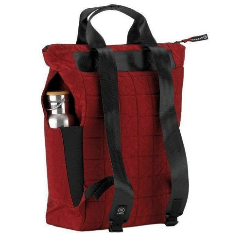 Een degelijke upcycled rugzak gemaakt van airbag-restmateriaal en gebruikte autogordels inclusief de gesp.