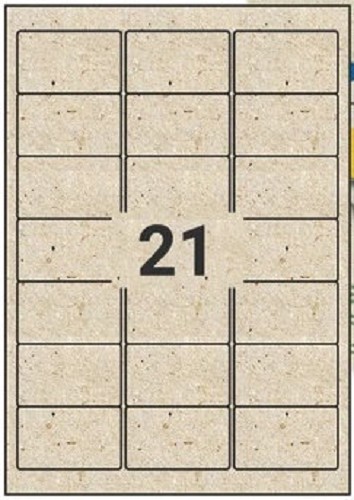 Etiketten gemaakt van graspapier. De helft van het graspapier is zongedroogd gras en de helft is FSC®-gecertificeerde papierpulp op houtbasis. Dit minimaliseert het verbruik van verse vezels en bespaart hout als hulpbron. Dit papier heeft een heel natuurlijke uitstraling door de bijzonder textuur met fijne grasvezeltjes. De snelgroeiende grondstof gras wordt gewonnen uit lokale weiden, zogenaamde compensatiegebieden. Deze etiketten worden in Duisland gemaakt. Graspapieretiketten zijn composteerbaar, recyclebaar en goedgekeurd voor direct voedselcontact volgens ISEGA. Bovendien zijn ze milieuvriendelijk en hulpbronnenbesparend bij de productie. De maat van het etiket: 63,5 x 38,1 mm. Per A4-vel: 3 rijen van 7 etiketten, totaal dus 21 etiketten per vel. Leverbaar per 5 vel of in een doos à 50 vel (voor zover op voorraad) 5 vel A4 = 105 etiketten 50 vel A4 = 1050 etiketten Geschikt voor laser en copieer-apparaat. Iets minder geschikt voor inkjetprinters. Let op: de zwarte lijnen op de foto staat alleen op de foto om de maat duidelijk te maken. De etiketten zijn onbedrukt.