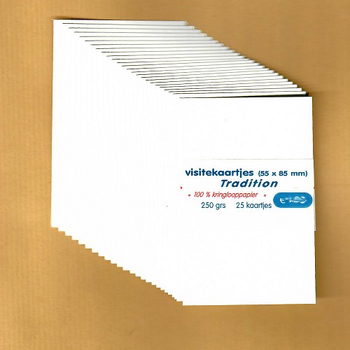 Mooie kleine kaartjes van lux recycled papier in de maat van een visitekaartje. Dit papier is niet glad, maar heeft een licht ruwe structuur, wat het papier een chic uiterlijk geeft. 25 kaartjes van 250 grams kringlooppapier. Formaat kaartje: 5,5 x 8,5 cm.