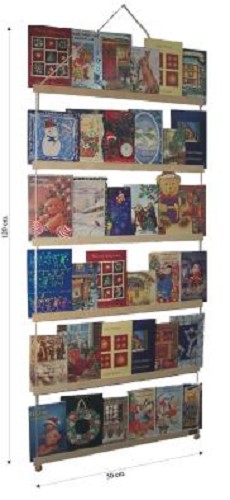 Handige houder van 6 houten latjes en gekleurd lint waarin u veel wenskaarten of foto's kwijt kunt. Niet alleen rond de kersttijd kunt u al uw kaarten presenteren op een leuke manier. De grote meerkaarthouder is 100 cm hoog (vanaf het bovenste latje) en 50 cm breed. De latjes zijn gemaakt van beuken of berkenplex. De kleur van het lint is creme-kleurig.